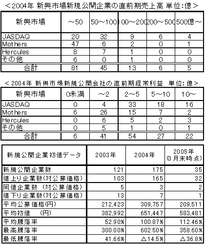 04年中に新興市場に新規公開した直前期の企業規模を見てみると、150社のうち54%が売上高50億円未満であり、売上高10億円未満の企業もあり将来性・成長性を期待されて上場に至っていると考えられます。また、経常利益は約31%の企業が2億円未満であり、経常損失を計上した企業は6社ありました。これらの企業も上場後の早期黒字化や高い成長性が期待されていると考えられます。