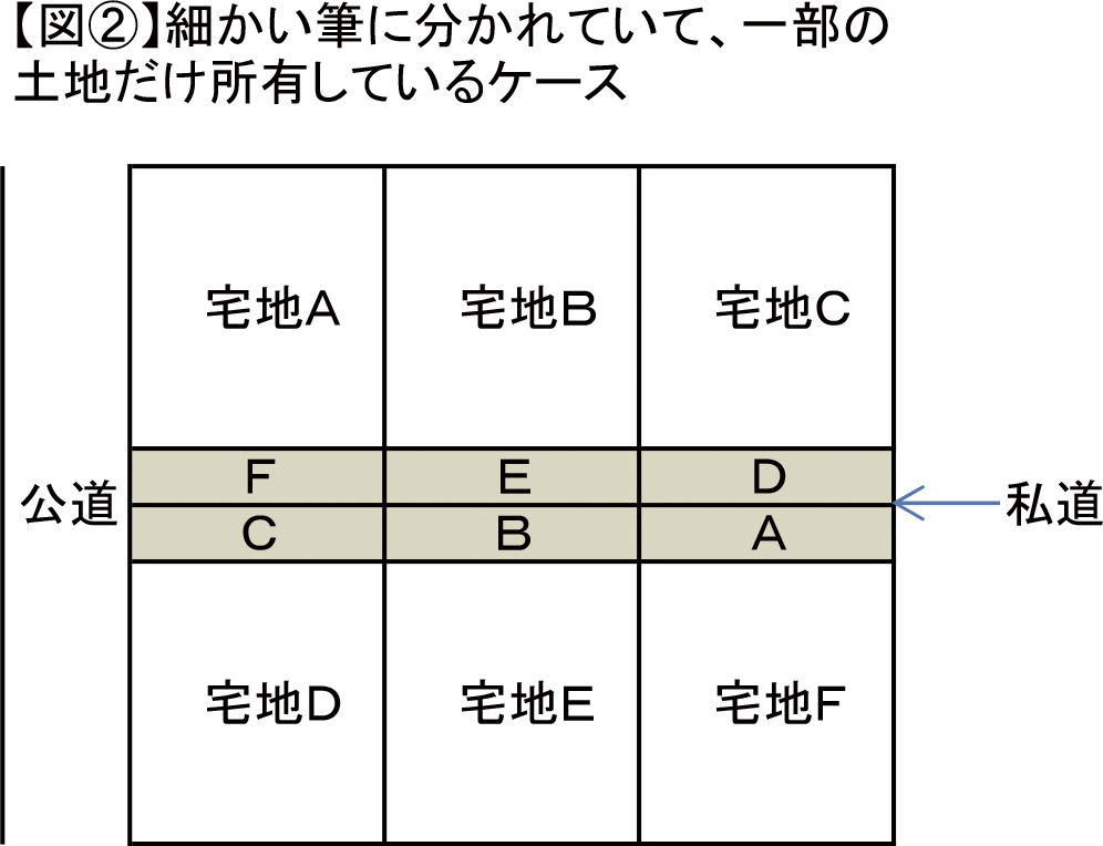 私道は実際道路として使われていますし、舗装を施してあることも多く、道路であるということはなんとなくわかると思います。しかし、その所有の態様は様々で、私道全部を一人が所有していることも当然ありますが、私道に接面する宅地の所有者全員で共有をしていたり(図①)、細かい筆に分かれていて、一部の土地だけ所有しているケース(図②)も多くみられるところです。