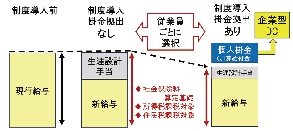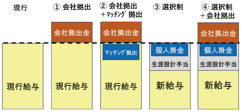 ③ 選択制:現行給与を分割し、生涯設計手当を導入。その中で個人掛金を拠出するか給与でもらうか選択できる